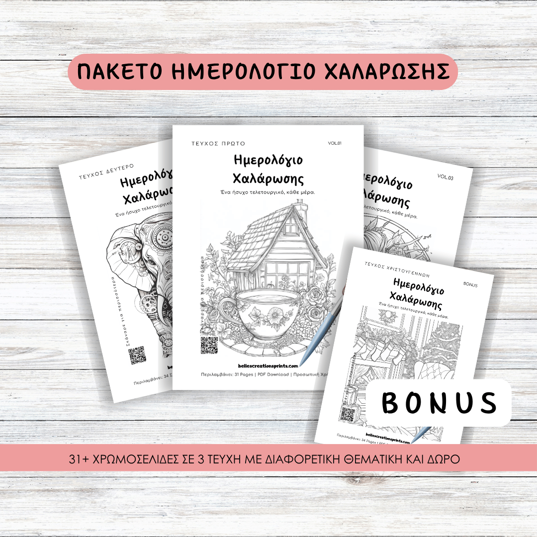 Το Ημερολόγιο Χαλάρωσης είναι ένα ψηφιακό αρχείο που σε βοηθά να επιβραδύνεις, να αποφορτιστείς και να αφιερώσεις λίγο χρόνο στον εαυτό σου μέσα στην καθημερινότητα. Περιλαμβάνει σελίδες χρωματισμού, απλές ασκήσεις χαλάρωσης, χώρο για σκέψεις και μικρές υπενθυμίσεις αυτοφροντίδας, χωρίς πίεση και χωρίς συγκεκριμένο πρόγραμμα. Το χρησιμοποιείς όποτε το χρειάζεσαι, με τον δικό σου ρυθμό, ως μια ήρεμη συνήθεια που υποστηρίζει την ψυχική σου ισορροπία.