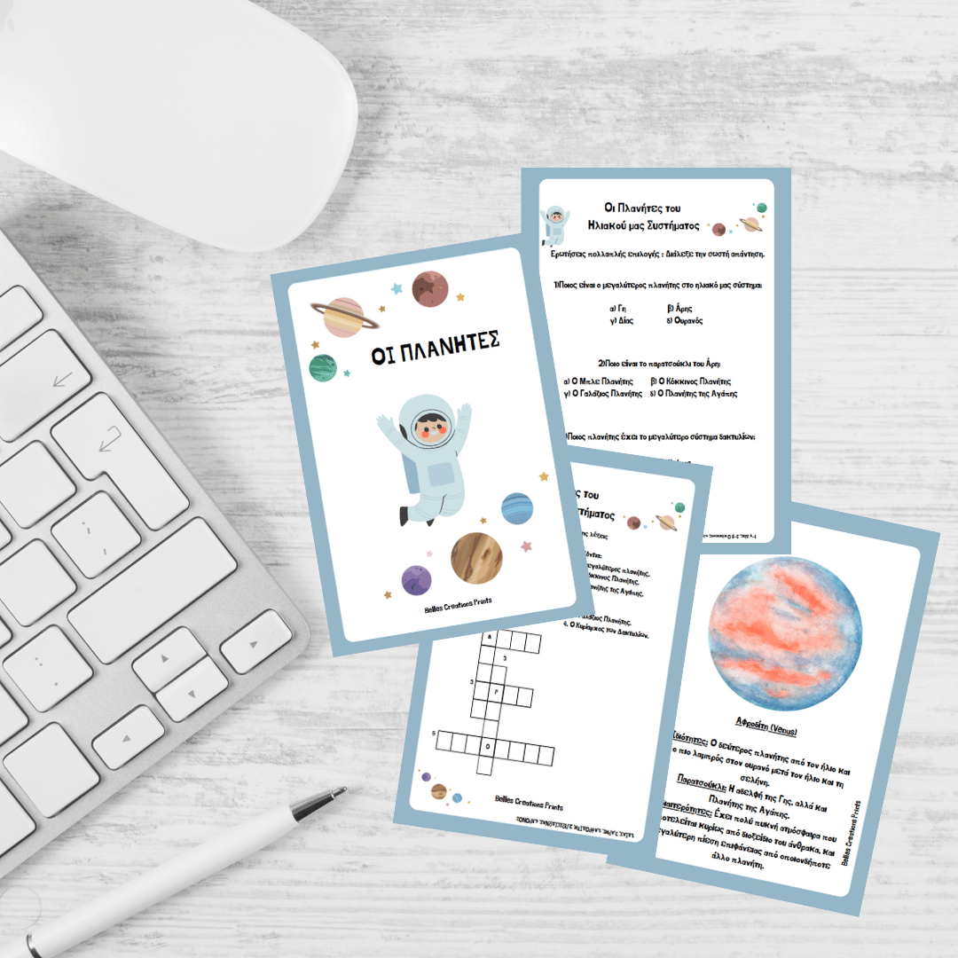 - 8 σελίδες με εικονογραφήσεις των πλανητών και τα βασικά χαρακτηριστικά τους